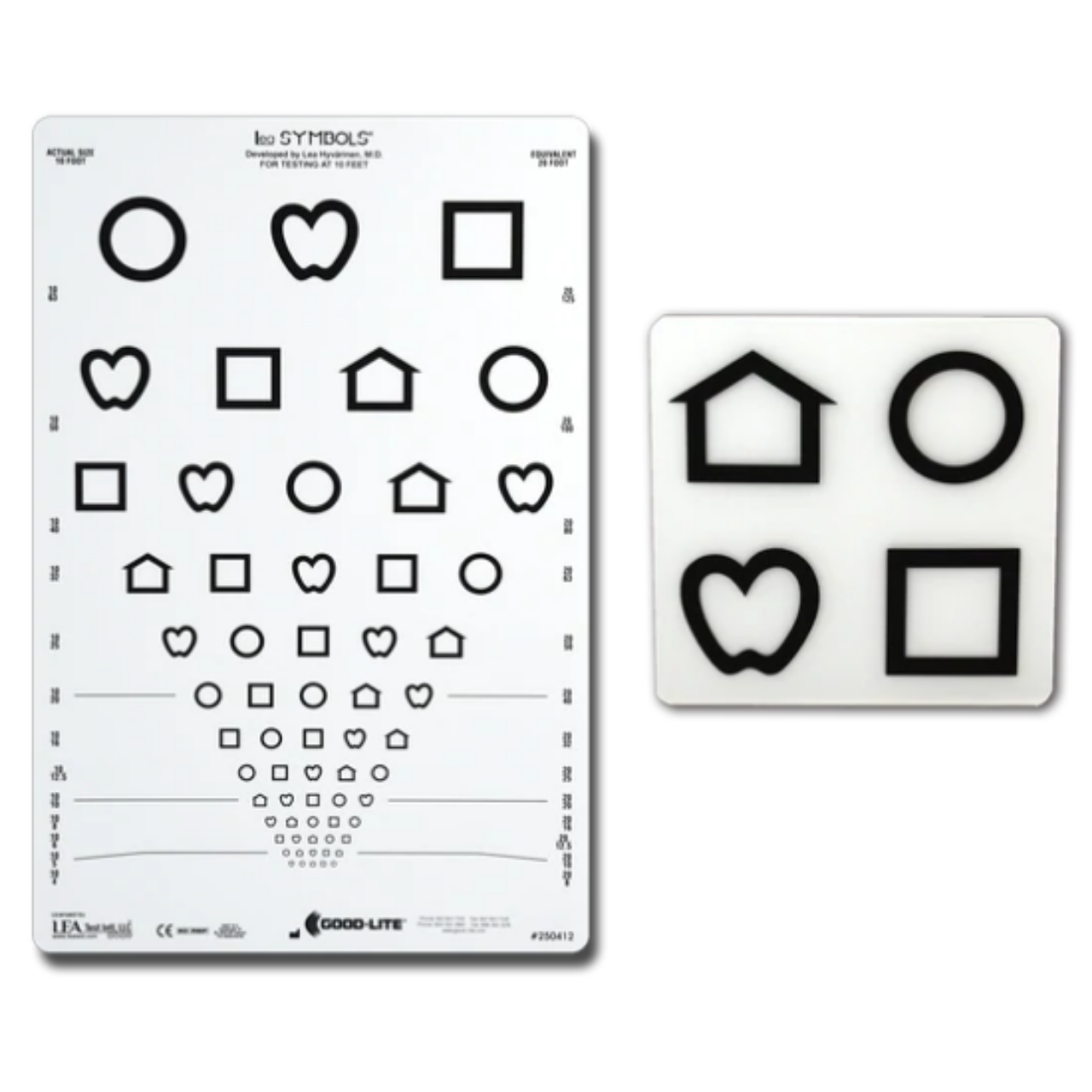 A LEA SYMBOLS® pediatric vision chart with proportionally spaced (logMAR) lines; line sizes range from 20/125 to 20/8 (6/38 to 6/2.4) equivalent. This chart can either be wall mounted or used in an ESV1200, ESV1500, or a Model A+ illuminated cabinet. Set includes the chart, a response key, and instructions. Features 10-foot and 20-foot notations only.