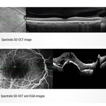Indocyanine green angiography (ICGA) enables imaging of the choroidal circulation below the retinal pigment epithelium (RPE). ICGA complements fluorescein angiography (FA), which captures blood flow above the RPE. Although ICG angiography is not a replacement for fluorescein, it provides adjunctive information which assists in defining the choroidal circulatory involvement in retinal pathology. Like with FA, SPECTRALIS HRA generates peak emission of light from the ICG dye and the cSLO camera captures clear detailed images of the choroidal vasculature.