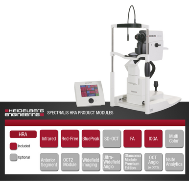 Like all SPECTRALIS models, the SPECTRALIS HRA features an upgradable, modular design: allowing configuration of each SPECTRALIS to the specific diagnostic workflow in the practice or clinic. Upgrade options include: SD-OCT, MultiColor™, widefield, ultra-widefield and anterior segment imaging.