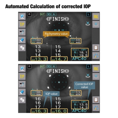 - Automated calculation function of the corrected IOP based on the central corneal thickness.